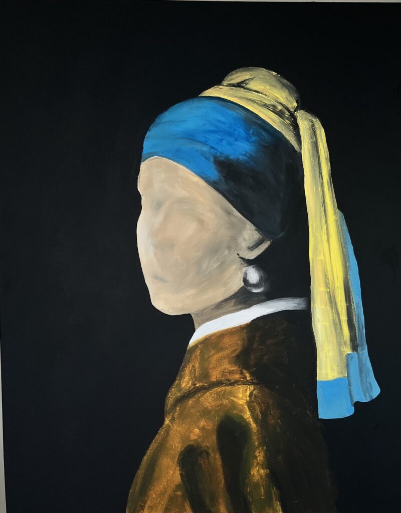 Pour ce projet, j’ai réalisé mon plus grand tableau à ce jour, une réinterprétation de La Jeune Fille à la Perle de Johannes Vermeer. Ce travail représentait un véritable défi personnel, notamment par l’utilisation de la peinture acrylique et la recherche des couleurs afin de rester proche de l’œuvre originale. J’ai cependant choisi de me l’approprier en retirant le visage, laissant volontairement une part de mystère. Ce choix permet au spectateur de projeter sa propre interprétation et de créer une connexion plus personnelle avec l’œuvre.