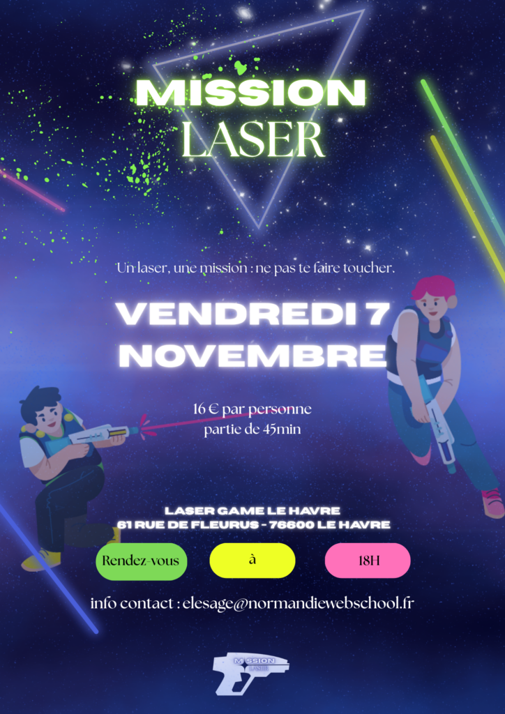 Le projet Laser Game, premier projet de l’année, m’a permis de mieux connaître mon équipe et de poser les bases du travail collaboratif. Il a représenté un premier pas dans le domaine de l’identité visuelle et de la communication. J’y ai découvert les enjeux liés à l’organisation d’un événement, notamment la recherche d’une activité accessible à tous, aussi bien sur le plan financier que logistique. Dans ce cadre, j’ai réalisé des affiches et un logo afin de rendre l’événement plus attractif et de lui donner une identité visuelle cohérente.